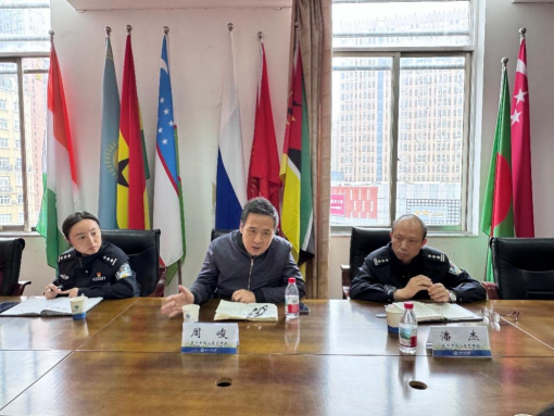 周峻大队长对学校留学生管理工作表示了充分肯定,他强调在当前形势下,高校留学生管理工作面临“增量”与“存量”并重的挑战,武汉工程大学国际学院制度完善、管理规范,留学生工作平安稳定。同时指出,留学生工作无小事,希望学校继续加大管理力度,排查和化解各类风险点,进一步强化警校协同共管机制,共同推动武汉工程大学来华留学生管理工作再上新台阶,为营造安全、有序、和谐的留学环境而共同努力。会上,潘杰警官结合具体工作实际,提出了一些宝贵的意见和建议。