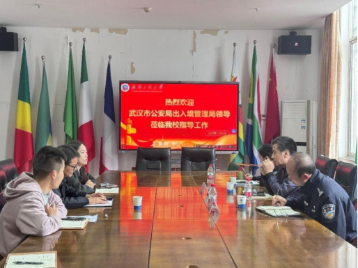 本网讯(通讯员 刘玎)近日,武汉市公安局出入境管理局周峻大队长、潘杰警官等一行莅临国际学院,就进一步规范与提升来华留学生管理服务工作进行实地考察与深入指导。国际学院直属党支部书记桂展鹏及留学生管理办公室人员参加了会议。