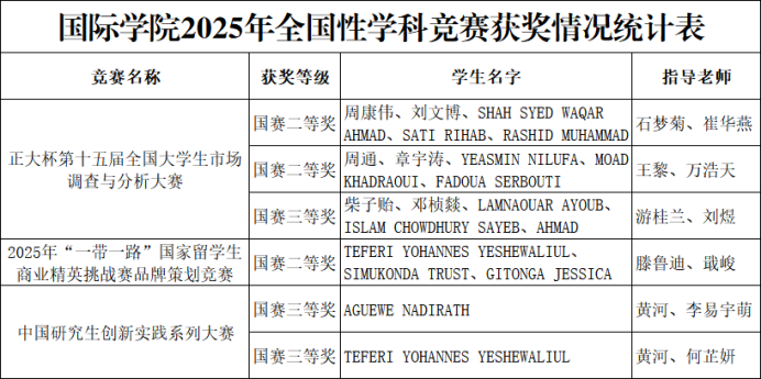 本网讯(通讯员 黄河)2025年全国性学科竞赛获奖名单陆续公布,国际学院留学生在各类赛事中表现突出,凭借扎实的专业基础、出色的实践能力和良好的跨文化协作水平,斩获国家级奖项共6项,其中二等奖、三等奖各3项,获奖数量与质量较往年有明显提升,充分展现了我校来华留学生教育的育人成效与国际化人才培养质量提高。